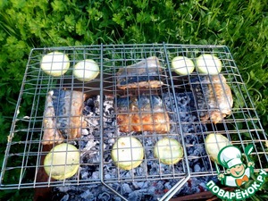 • Угли уже готовы, рыбу сложить пополам, шкуркой наружу и распределить на решетке, смазанной маслом.