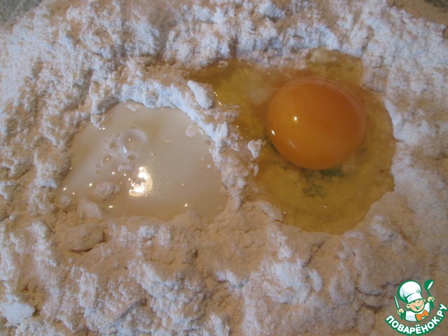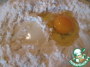 Муку просеять, смешать с солью, сахаром и разрыхлителем. Добавить сливочное масло, порезанное кусочками, растереть в крошку. Добавить яйцо и молоко.