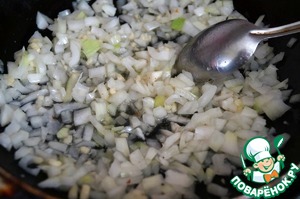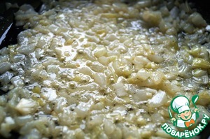 На маленьком огне, постоянно помешивая, прогреваем-томим наши овощи до прозрачного полумягкого состояния, не румяним. Лук должен стать прозрачно-золотистого цвета, а чеснок просто потеряется.