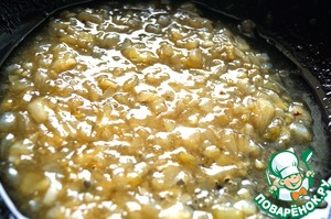 Добавляем в сковороду мёд и сахар и, продолжая мешать, карамелизуем лук. Сначала кажется, что всё очень жидко, но скоро масса станет янтарного цвета и вязковатой. Это сигнал к добавлению остальных ингредиентов.