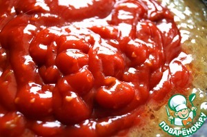Добавляем вочестерширский соус и яблочный уксус. Вочестерширский соус можно заменить на смесь соевого соуса и рисового уксуса, или рыбного соуса с бальзамическим уксусом, или вообще не добавлять, а увеличить количество яблочного уксуса. Туда же выкладываем кетчуп ( у меня - "Махеев", но можно любой, который вам просто не очень вкусен). Беспрерывно мешаем, прогревая на маленьком огне, до полного смешивания ингредиентов.
