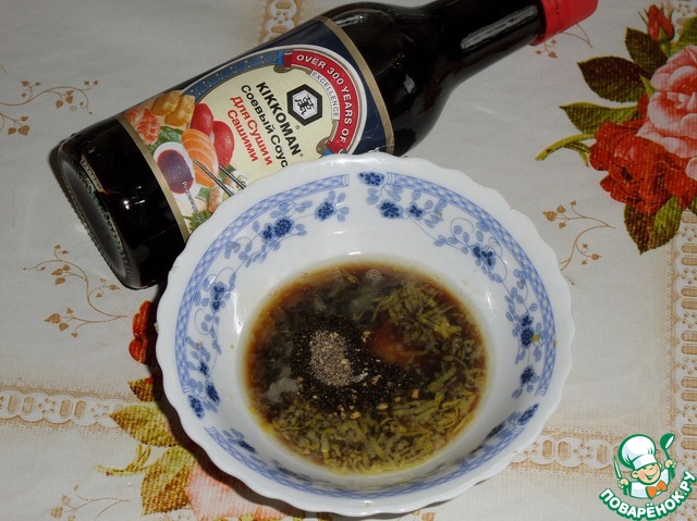 Готовим маринад. В чашечку выжимаем лимонный сок и кладем натертую цедру. Затем добавляем соль, лимонный перец и соевый соус ТМ "Kikkoman". Хорошо перемешиваем.