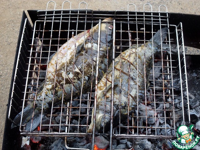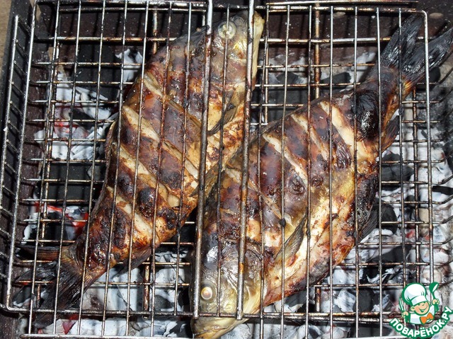 Через 40 минут выкладываем рыбу на решетку. Жарим на мангале.