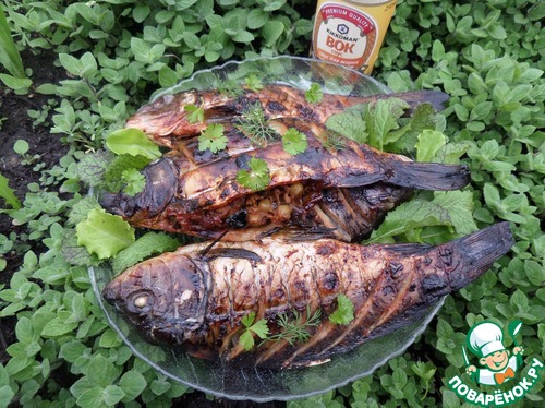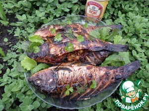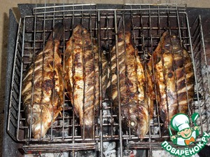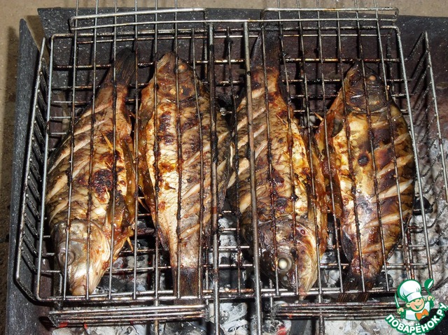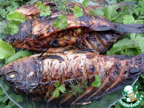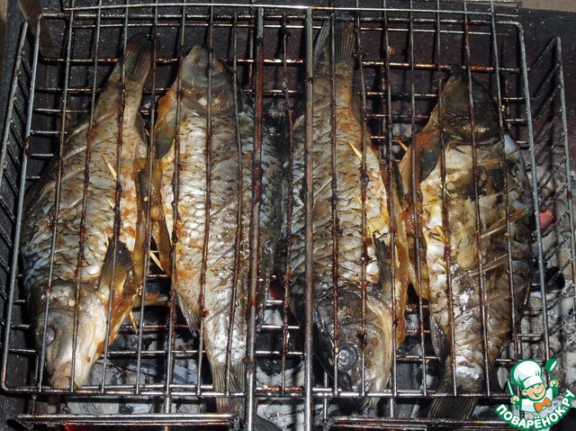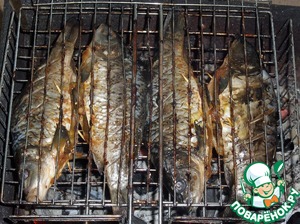 Выкладываем фаршированную рыбу на решетку. ( дополнительно можно скрепить брюшки зубочистками, чтобы начинка не выпадала). Обжариваем на мангале.