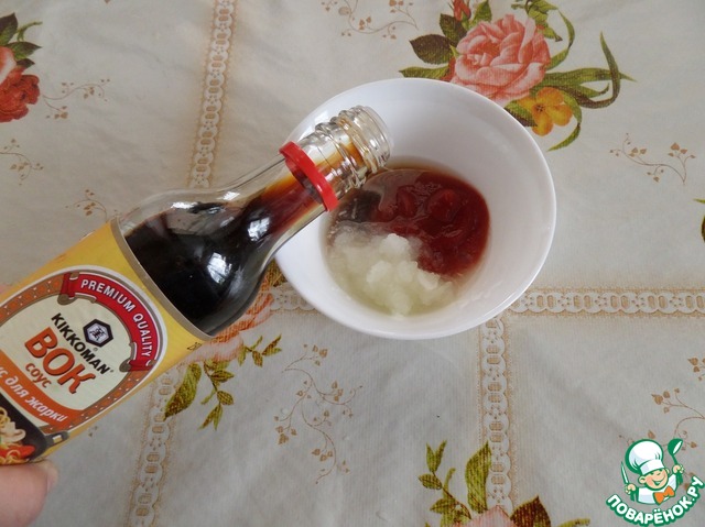 В чашечку натираем на мелкой терке 1 луковицу. Добавляем томатный соус и 2 ст. л. соуса "ВОК для жарки " ТМ "Кikkoman ". Солим.