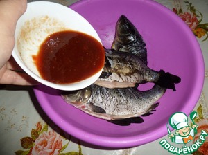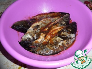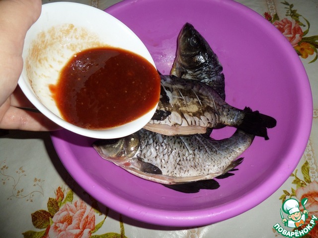 Выкладываем рыбу в чашку. Добавляем приготовленный маринад.