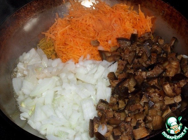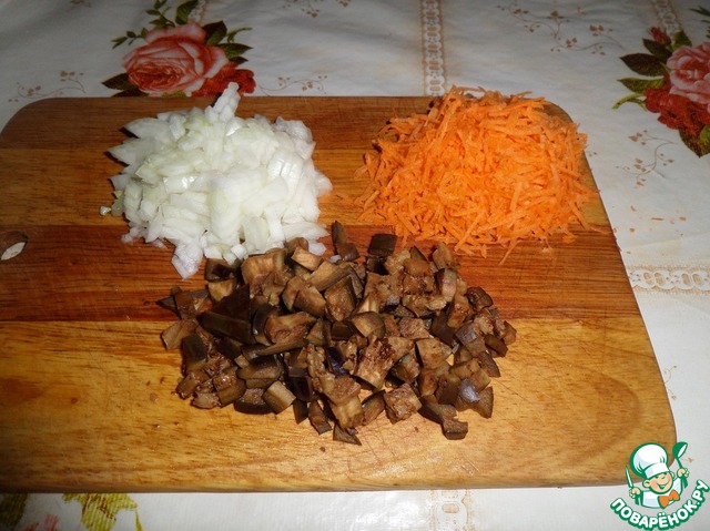 Пока маринуется рыба, приготовим начинку. Нарезаем мелким кубиком лук и баклажаны ( у меня замороженные из собственных заготовок) и натираем на терке морковь.