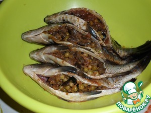 Через 1 час вынимаем чашку с рыбой из холодильника. В брюшко каждой рыбы выкладываем подготовленную овощную начинку.