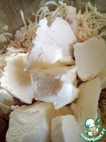 • Добавить сливочное масло. Тут я немного отошла от рецепта, у меня был не большой кусок куриного вареного мяса. Решила мелко порезать и добавить.