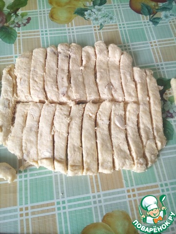 • Тесто оставить отдыхать на 30 минут. По истечению времени раскатать тесто в пласт толщиной 1 сантиметр. Нарезать пласт на палочки. Палочкам придать округлую форму.