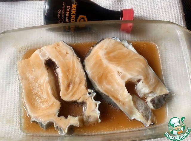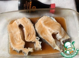 Для маринада смешать 50 мл апельсинового сока, масло, соевый соус (1,5 ст. л.). Положить в него рыбу, обвалять ее со всех сторон и оставить на 30 минут.