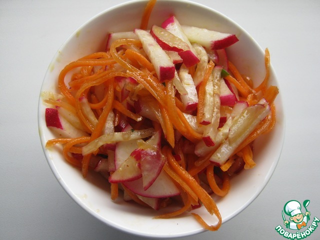 Редис нарезать кругляшками, а затем соломкой не очень тонко.
