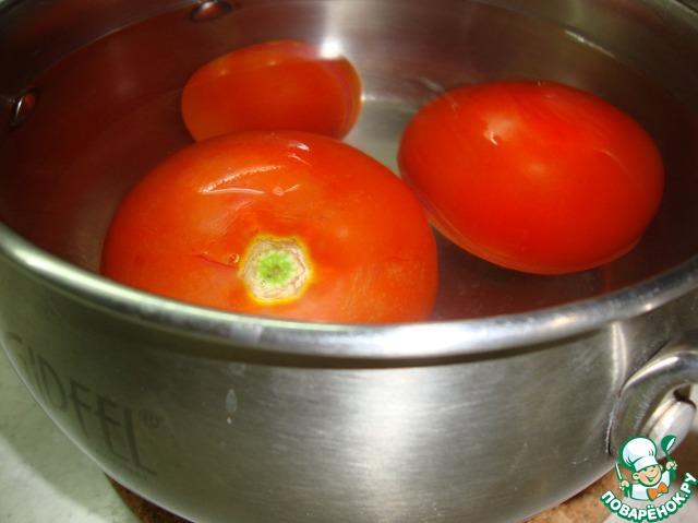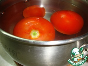 Помидоры поместить в кипяток для того, чтобы очистить легко от кожицы.