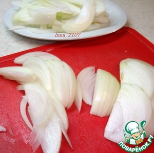Нарезать перьями лук.