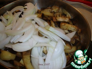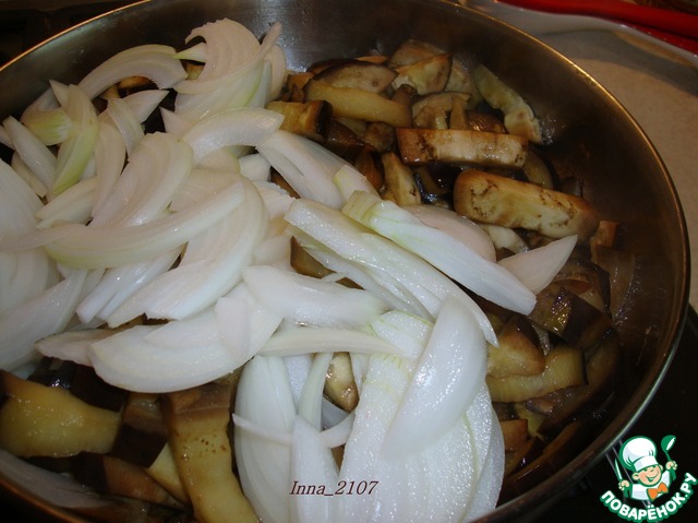 Добавить лук к баклажанам и продолжить тушение.