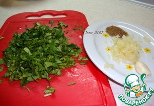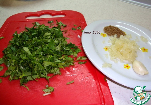 Нарезать кинзу и измельчить чеснок.