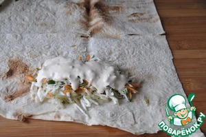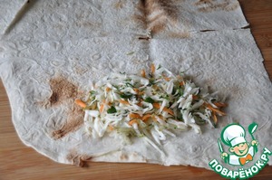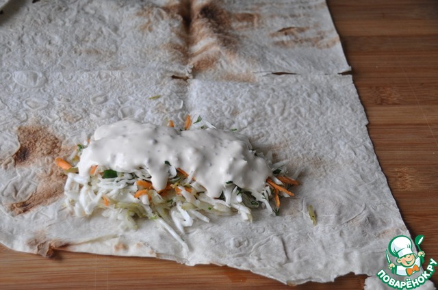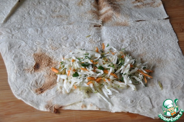 Подаём сразу тёплый хрустящий конвертик из лаваша с капустным салатом.