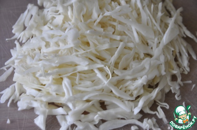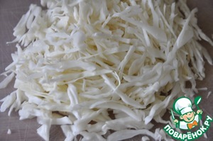 Капусту режем тонкой соломкой и слегка перетираем с солью.