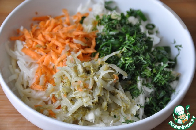 К капусте добавляем тёртые на средней тёрке морковь и маринованные огурчики, резанный колечками зелёный лук (перо) и рубленный укроп. Перемешиваем.