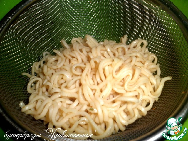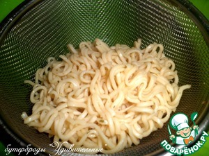 Вермишель быстрого приготовления, стандартную пачку - 60 г, залить кипятком на три минутки и откинуть на дуршлаг, дать подсохнуть и остыть. Иногда перемешивая, чтоб не слиплись. Специи, прилагающие в пакетике, не добавлять.