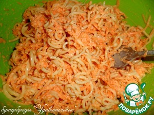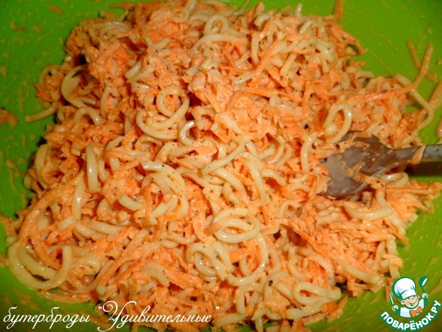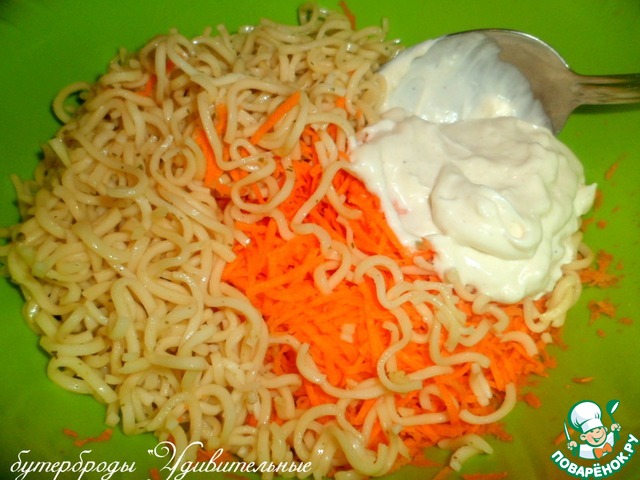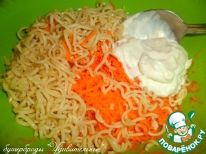 Добавить к моркови вермишель и майонез. Майонез тоже, исключительно своего приготовления. Кто на диете или не ест майонез, замените сметаной, добавив в нее горчицу или возьмите йогурт.