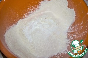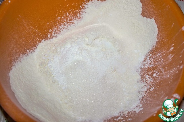 В миске смешиваем муку, крахмал, сахар, соль, соду, разрыхлитель.