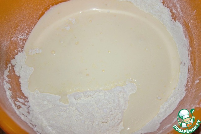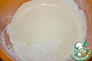 В мучную смесь вливаем молочную. Тщательно вымешиваем, лучше венчиком, чтобы не было комочков.