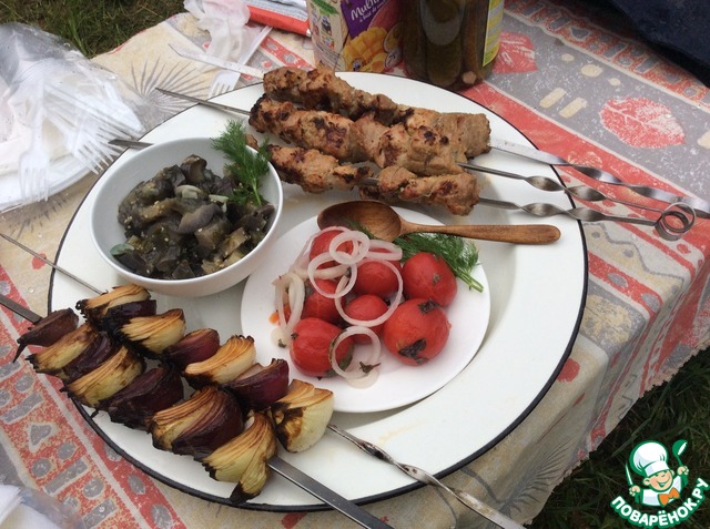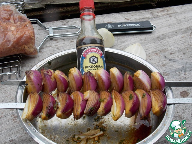 Нанизываем на шампур так, что лук как бы стоит, близко друг к другу.