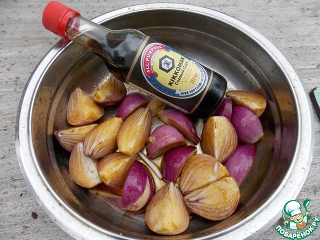 Берем любой репчатый лук, в этот раз у меня красный. Чистим и разрезаем на 4 части вдоль. Смешиваем соевый соус "Kikkoman", масло, лимонный сок и белый перец. Можно конечно использовать и черный, но тогда лук получится в крапинку. Поливаем лук, перемешиваем и даем постоять 15 мин.