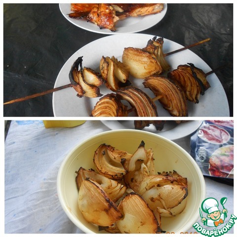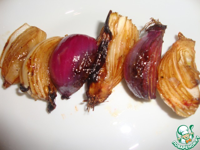 Запекаем на не жарких углях примерно 10 мин. переворачивая постоянно. Как только увидите, что лук начал раскрываться, проливаем его (сняв с мангала ) оставшимся соусом, чтобы он попал во внутрь.