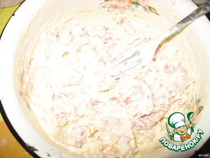 Пока основа печется, готовим начинку: режем кубиками колбасу, курицу рвем на мелкие кусочки. Смешиваем в миске сыр, майонез, курицу и колбасу.