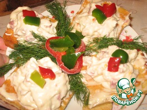 Хрустящая основа похожая на крекер, покрытая нежной смесью из кремового сливочного сыра, ароматной копченной колбаски и копченой курочки с капелькой майонеза для пикантности и сочными мясистыми перчиками для свежести и буйства красок...