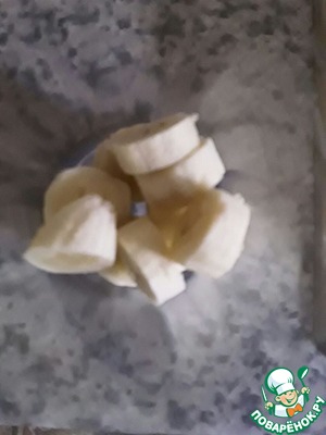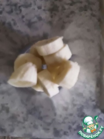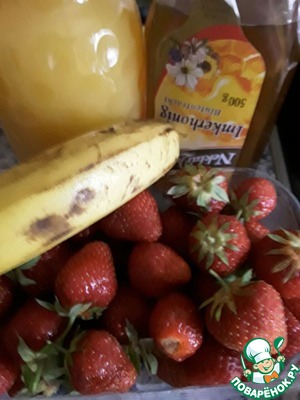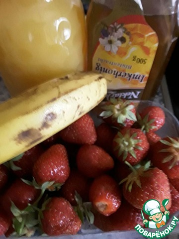 • Добавляем к банану мёд, апельсиновый сок и замороженную клубнику.