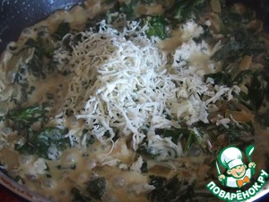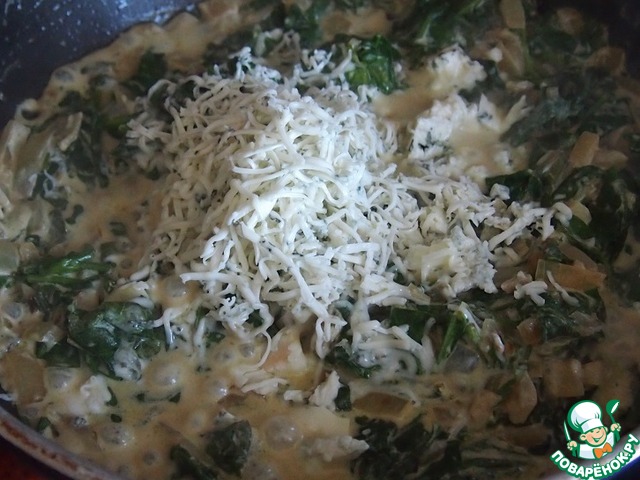 Добавить шпинат, тушить до того, как он уменьшится в объеме. Посолить и поперчить по вкусу. Добавить мелко натертый сыр и поварить до загустения. Если есть возможность использовать голубой сыр, обязательно воспользуйтесь этим. Вкус будет потрясающий.