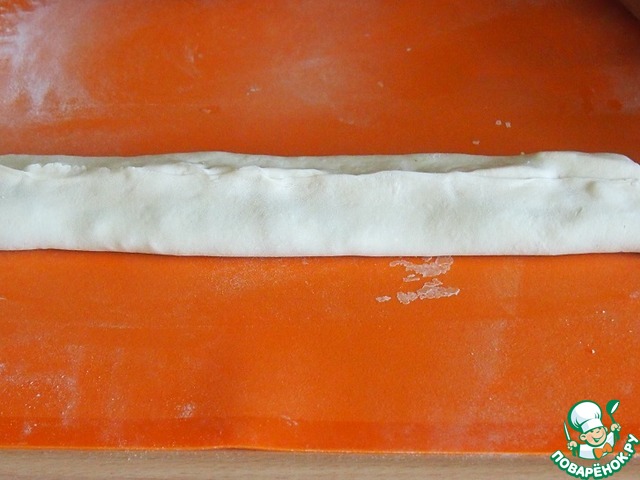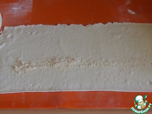 Слоеное тесто раскатать тонко в форме длинного прямоугольника. У меня пачка теста из трех частей, поэтому я делала пирог из трех рулетов. На середину полоски теста насыпать немного сухарей.