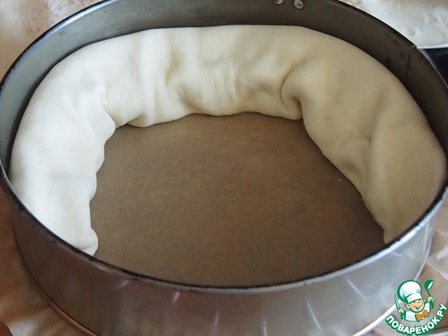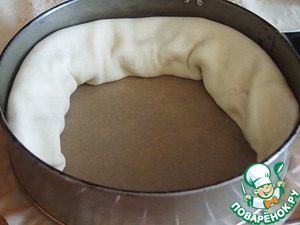Форму смазать маслом ( уменя форма диаметром 24 см). Уложить рулет по кругу. Можно выпекать и просто в форме рулета.