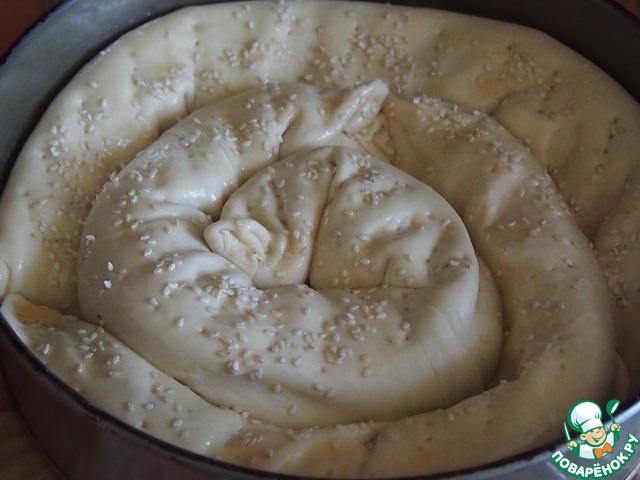 С остальными двумя частями теста поступить точно так же. Смазать пирог яйцом, посыпать кунжутом и поставить в разогретую духовку. Печь при температуре 190 градусов примерно 30 минут.