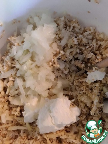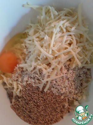 Добавляем к натёртой капусте овсяные хлопья, яйцо, кунжут и натёртый сыр! Всё хорошо перемешиваем.