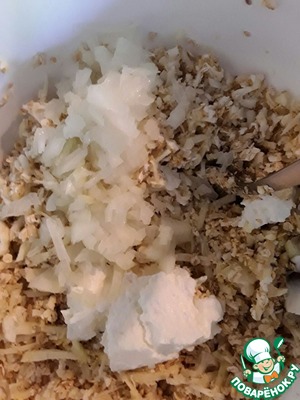 Добавляем в общую массу лук и творог, солим и перчим по вкусу. Снова всё тщательно перемешиваем. При желании можете добавить любые любимые вами травы и специи!