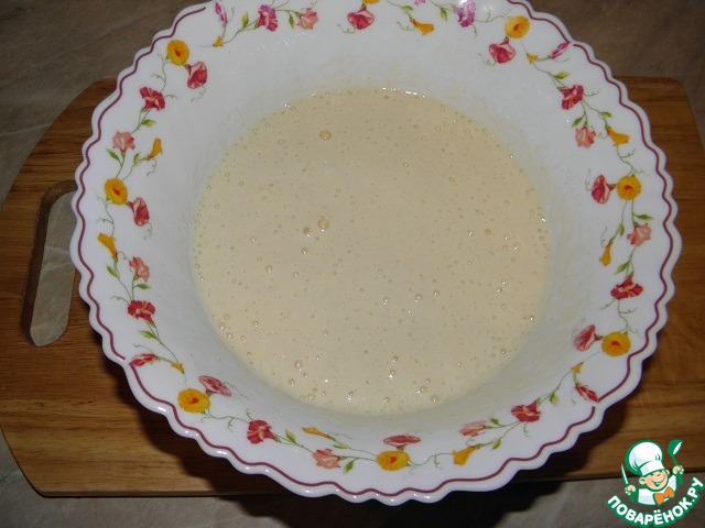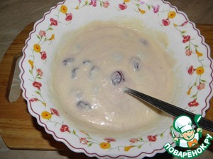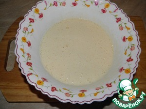 • Жидкую кефирно-яичную массу влить в сухую манную смесь, перемешать, тесто должно быть однородным.