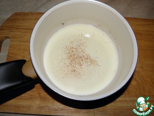 Сливки подогреть на слабом огне до температуры 40%, посолить, добавить мускатный орех и перемешать.