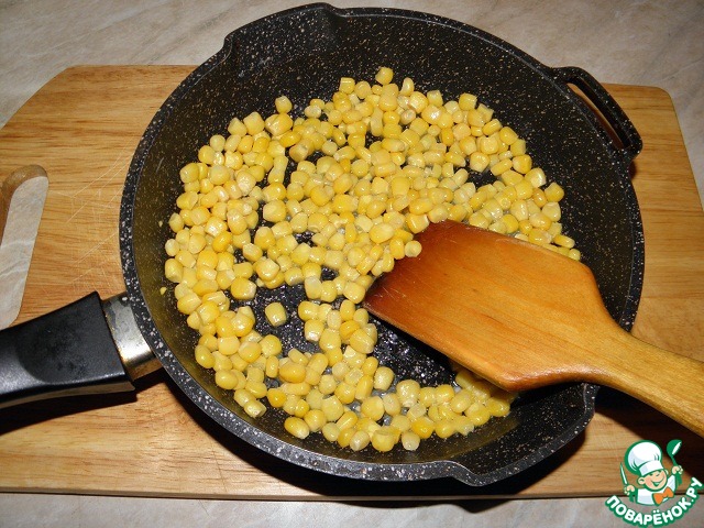 Прогреть кукурузу в разогретой сковородке 1-2 минуты, постоянно мешая.