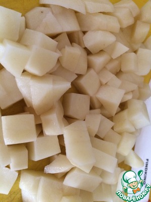 Пока наша рыбка варится чистим и нарезаем небольшими кубиками картофель. Как только вода закипит, солим и перчим наш бульон по вкусу, добавляем лавровый лист, выкладываем картофель