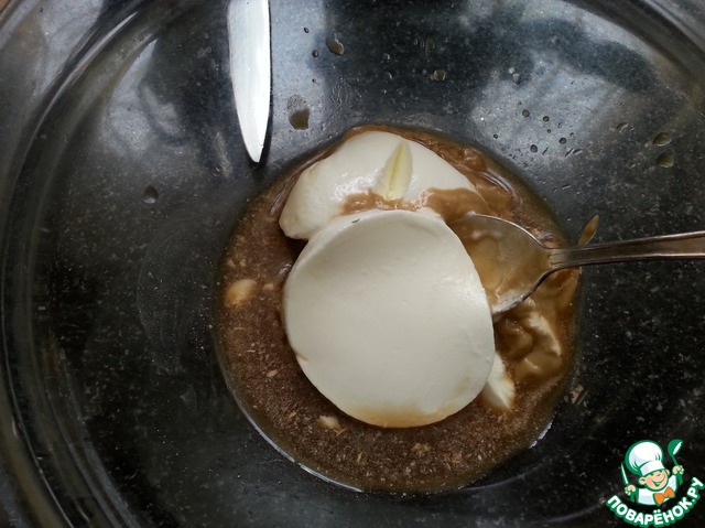 Делаем заправку. Соединить сметану, соевый соус, уксус ( в рецепте был яблочный уксус, но я добавила обычный) и горчицу. Все хорошо перемешать. Заправка готова.