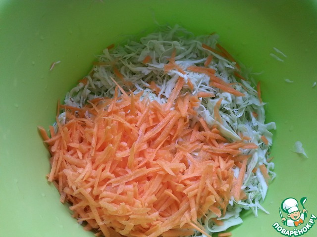 Капусту нашинковать тонко. Слегка помять руками без соли.