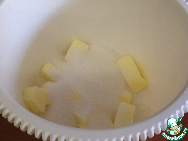 Возьмем 150 г размягченного сливочного масла и 150 г сахара, взобьем до пышной мягкой массы...