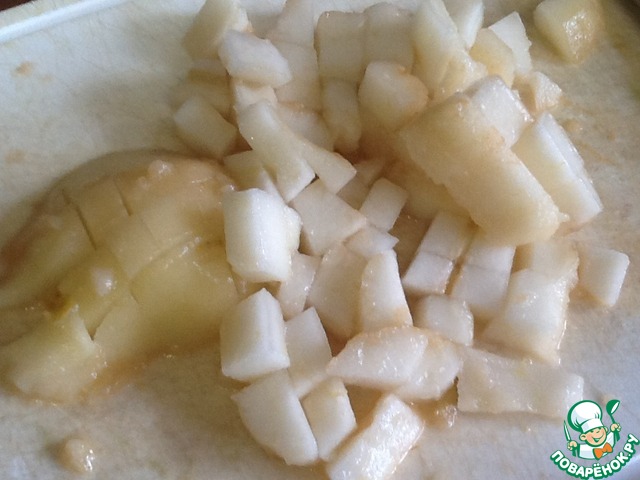 Пока миксер взбивает тесто, почистим и порежем грушу.