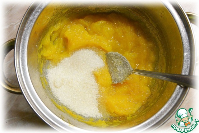 Тыкву измельчить в блендере или толкушкой. Добавить сахар,