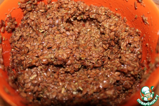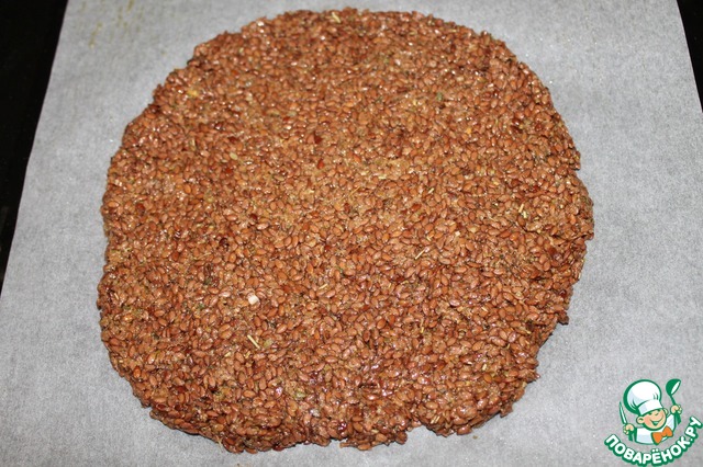 Противень выстилаем пергаментом, смазываем его маслом, выкладываем льняную массу слоем в 3-5 мм. Запекаем 35 минут при 180 градусах.