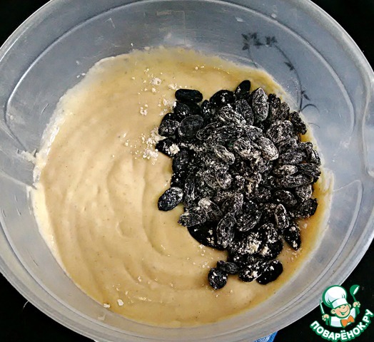 Изюм обвалять в муке (около 2 ч. л.) и добавить в тесто. Перемешать. Тесто получается густоватое.